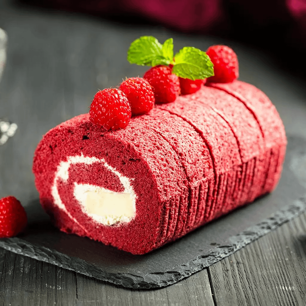 Red velvet sudah lama menjadi simbol hidangan premium dengan warna merah yang ikonik, sangat selaras dengan nuansa Natal. Dalam bentuk roll cake, tampilannya terlihat lebih modern, rapi, dan mudah dipotong untuk dinikmati bersama.